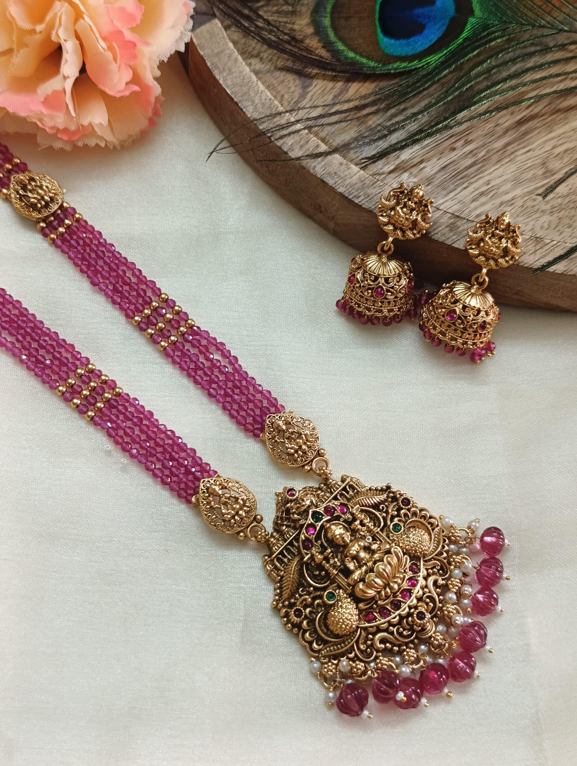This Long Haram Necklace is a timeless piece of traditional ethnic jewellery, inspired by classic South Indian temple designs. Crafted to enhance festive and bridal looks, this long haram adds elegance and heritage charm to any outfit.